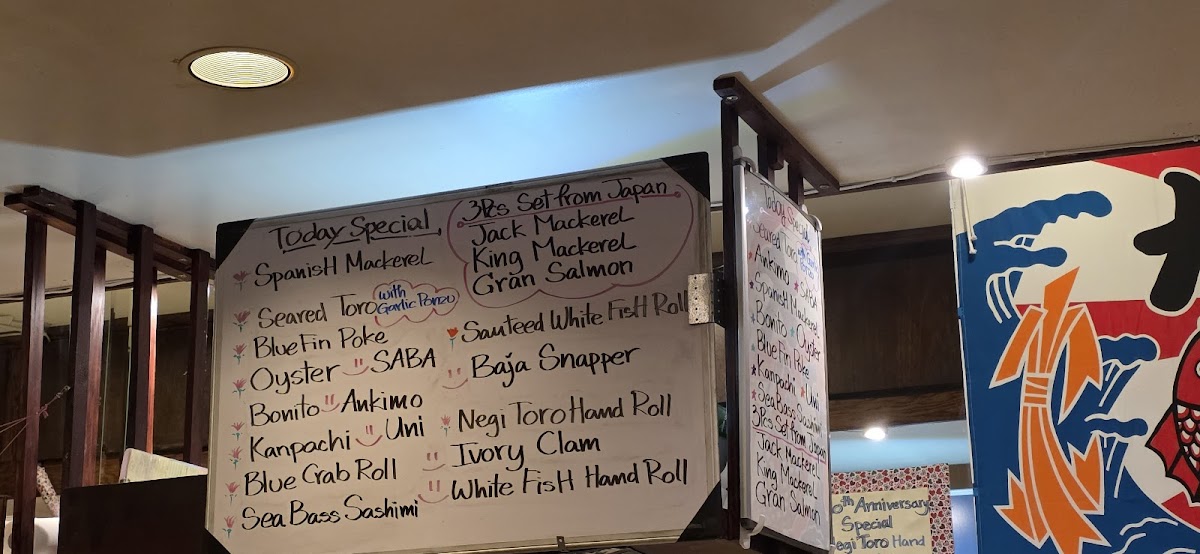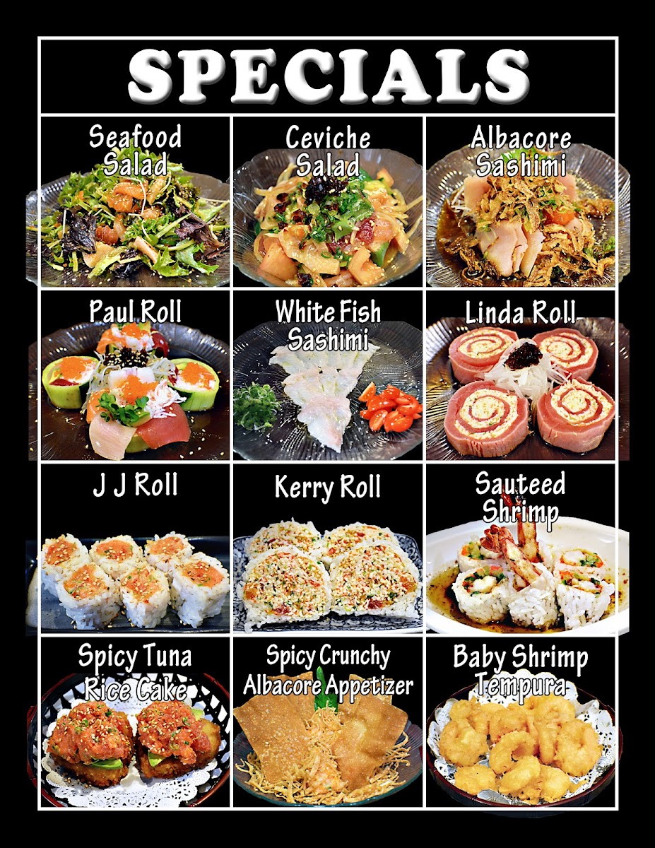 The menu offers a variety of Japanese and Asian dishes with a focus on sushi and sashimi. It is organized into sections including specials, appetizers, rolls, nigiri, sashimi, and cooked seafood items. Guests can expect to find traditional sushi options like Unagi Nigiri, Amaebi Sweet Shrimp Nigiri, and Ikura Salmon Roe alongside specialty rolls such as the Kerry Roll, Linda Roll, Carrie Roll, and Paul Roll.